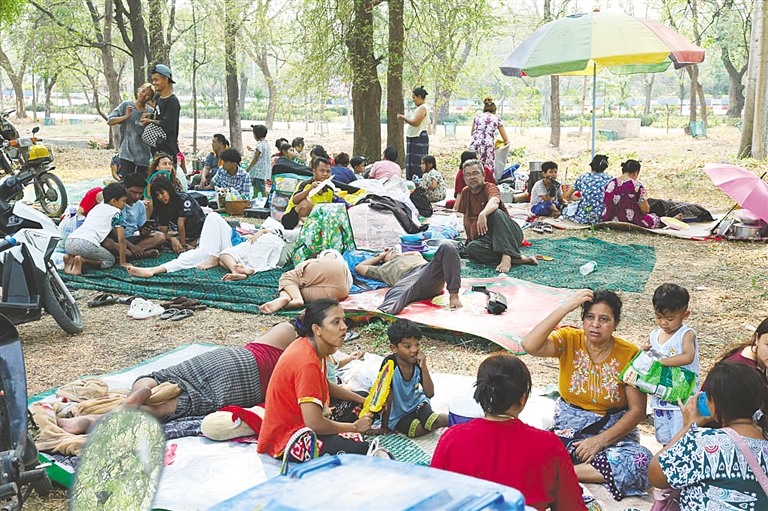3月29日,在缅甸曼德勒,受灾民众在户外开阔地避险。 新华社发