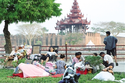 4月1日,在缅甸曼德勒,受灾民众在曼德勒皇宫附近避难。据缅甸媒体4月1日报道,强震已在当地造成2719人遇难。新华社发