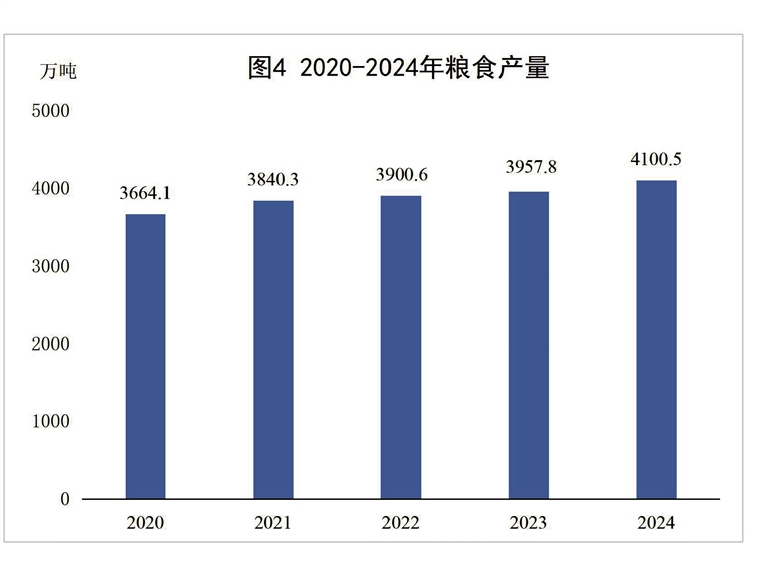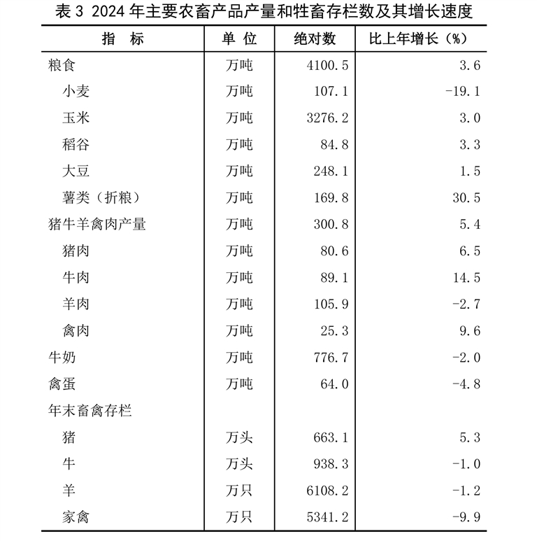 全年农作物总播种面积893.5万公顷。其中,粮食作物播种面积701.2万公顷,比上年增长0.4%。粮食产量4100.5万吨,比上年增长3.6%。其中,玉米产量3276.2万吨,增长3.0%;大豆产量248.1万吨,增长1.5%;薯类(折粮)169.8万吨,增长30.5%。
