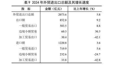 全年外贸进出口总额2073.6亿元,比上年增长5.8%。其中,出口852.8亿元,增长9.2%;进口1220.8亿元,增长3.6%。从主要贸易方式看,一般贸易进出口额1303.4亿元,增长7.0%,占进出口总额的比重为62.9%;边境小额贸易进出口额292.9亿元;加工贸易进出口额64.2亿元。对共建“一带一路”[24]国家进出口额1679.3亿元,比上年增长9.6%。