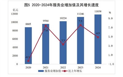 全年批发和零售业增加值2083.8亿元,比上年增长7.1%;交通运输、仓储和邮政业增加值1582.7亿元,增长5.5%;住宿和餐饮业增加值395.5亿元,增长4.0%;金融业增加值946.6亿元,增长2.5%;房地产业增加值1031.7亿元,增长1.4%。全年规模以上服务业[14]企业营业收入比上年增长8.0%。