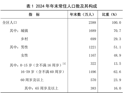 [5]2024年年末,全区0-14岁(含不满15周岁)人口为298万人,15-64岁(含不满65周岁)人口为1707万人。