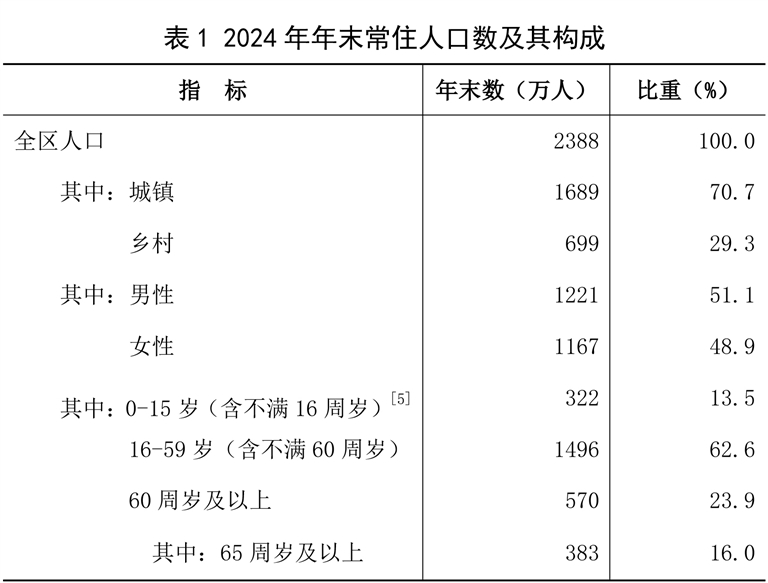 年末常住人口[3]2388万人。其中,城镇人口1689万人,乡村人口699万人。男性人口1221万人,女性人口1167万人。全年出生人口13.2万人,出生率为5.52‰;死亡人口20.0万人,死亡率为8.36‰。