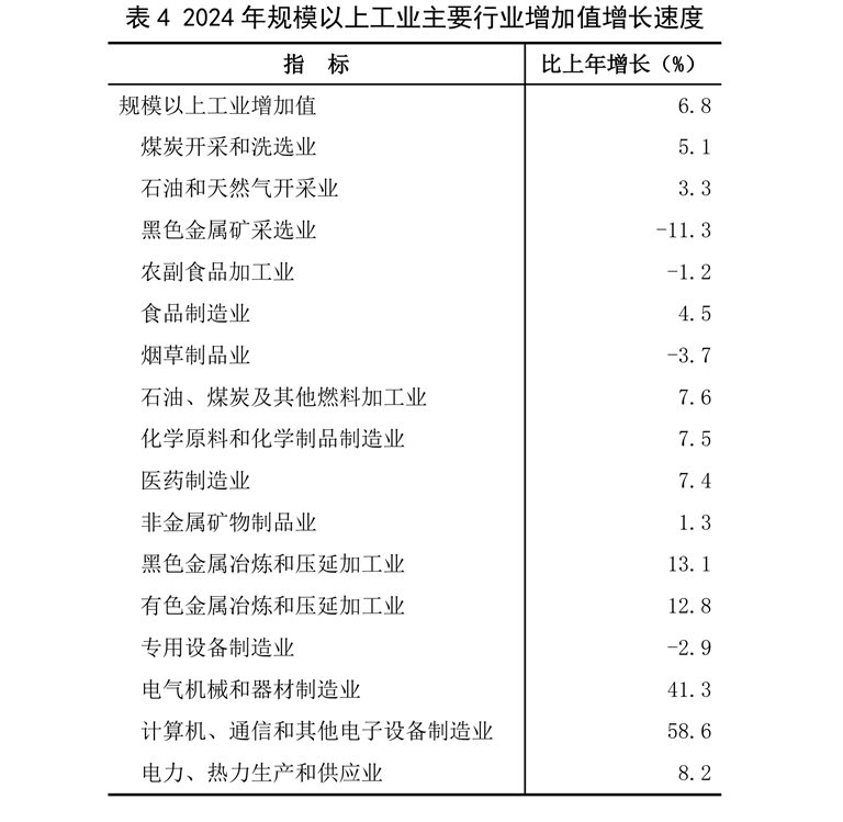 全年规模以上工业中,煤炭开采和洗选业比上年增长5.1%,食品制造业增长4.5%,石油、煤炭及其他燃料加工业增长7.6%,化学原料和化学制品制造业增长7.5%,非金属矿物制品业增长1.3%,有色金属冶炼和压延加工业增长12.8%,专用设备制造业下降2.9%,电气机械和器材制造业增长41.3%,计算机、通信和其他电子设备制造业增长58.6%,电力、热力生产和供应业增长8.2%。