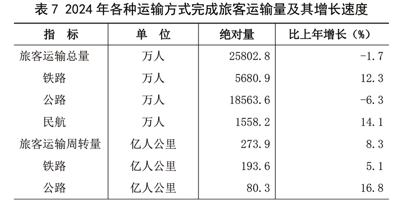 [16]自2024年1月起,公路旅客运输量、公路旅客运输周转量统计口径进行了调整,将班车包车客运量、公共汽电车城际城乡客运量、出租汽车(含巡游出租汽车、网络预约出租汽车)城际城乡客运量纳入公路旅客运输量统计,公路旅客运输周转量统计口径相应调整。2024年旅客运输总量、旅客运输周转量、公路旅客运输量、公路旅客运输周转量增速按可比口径计算。