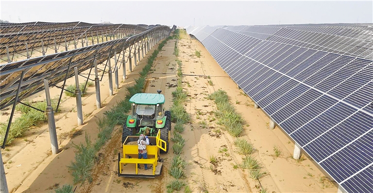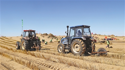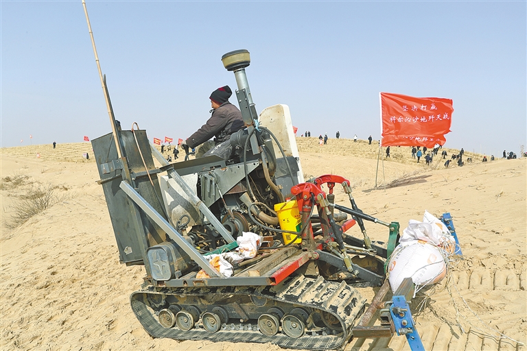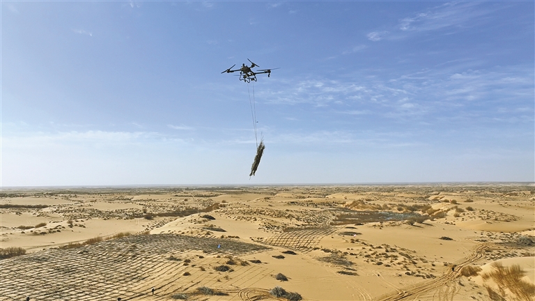 走进鄂尔多斯市乌审旗乌审召镇布日都嘎查治沙项目现场,空中,大型无人机撒播草种、运输苗木和沙障制作材料,地面上,沙障扎捆机、草帘沙障铺设机等机械设备忙中有序铺设沙障。科技力量的投入,使治沙更加精准高效,为打赢毛乌素沙地歼灭战注入强劲动力。