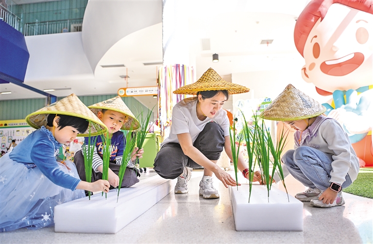 4月4日,呼和浩特市老牛儿童探索馆工作人员给孩子们讲解水稻插秧方法。当日,为弘扬传统节气文化,丰富儿童假期体验,老牛儿童探索馆举行了“万物清明·童趣探春”主题活动,通过绘制五彩纸鸢、制作青团等趣味活动,让孩子们在体验中感受传统文化的魅力。本报记者 孟和朝鲁 摄