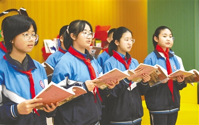 4月9日,呼和浩特市第四十三中学七年级一班的同学们在朗诵经典乐府诗《木兰诗》。为推广普及国家通用语言文字,该校开展了课前三分钟的“小先生课堂——古诗文欣赏”“诵读红色家书 牢记初心使命”朗诵比赛、限时作文大赛等丰富多彩的活动,提升学生们的国通语水平。本报记者 王磊 摄
