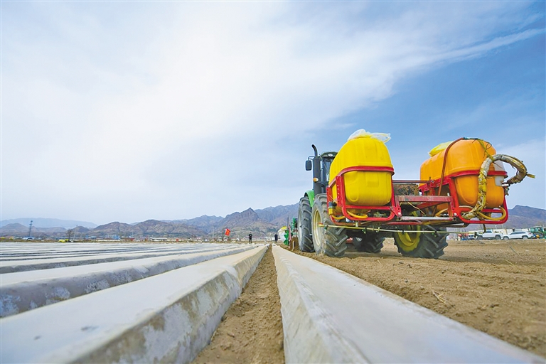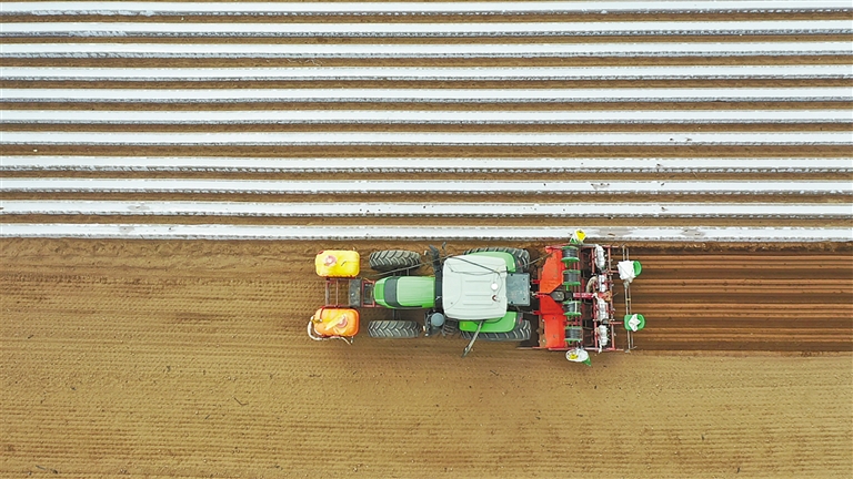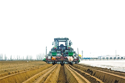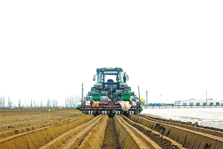 春回大地,万象更新。在呼和浩特市土默特左旗什报气村萝卜种植基地,一台搭载木牛导航系统的智能起垄播种机正在作业。机械精准开出深约30厘米相同的种植沟,同步完成起垄、播种、覆土、覆膜等工序,较传统人工效率翻番。