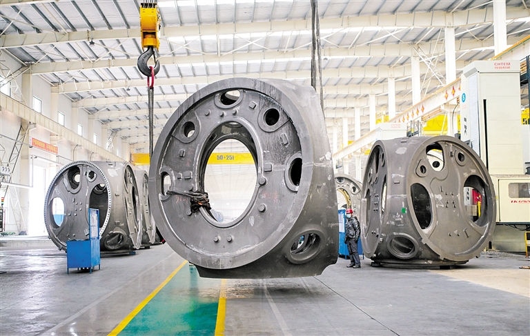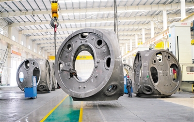4月13日,通辽市蒙东(通辽)高端重型装备制造产业基地内,工作人员正在加工风力发电机零部件。近年来,通辽市科尔沁区锚定风电装备制造产业发展方向,先后投产子项目16个,初步形成了全产业链发展格局。本报记者 孟和朝鲁 摄