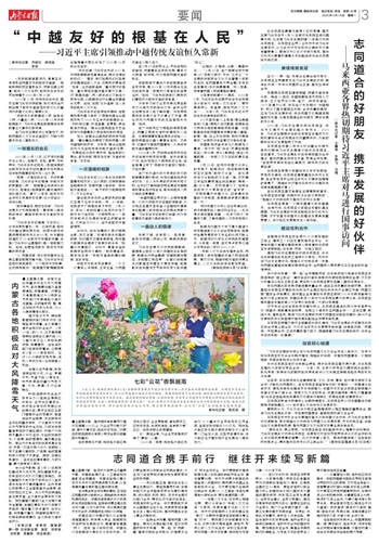 ——加强人文交流,拉紧民心相通纽带。要以今年举办“中越人文交流年”为契机,开展丰富多元的人文交流。中方欢迎越南民众多到中国各地“串门”,也鼓励中国游客到越南风景名胜“打卡”。要共同办好中越青年友好会见、边民大联欢等有温度、接地气、聚民心的人文交流活动,深挖红色资源,讲好两国人民友好故事,把中越友好接力棒一代代传下去。