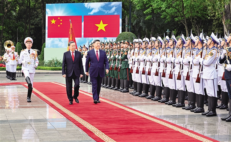 欢迎仪式后,习近平和苏林一同步行前往越共中央驻地举行会谈。沿途数百名越南民众挥舞两党两国旗帜,对习近平表示最热烈的欢迎。习近平向欢迎人群挥手致意。