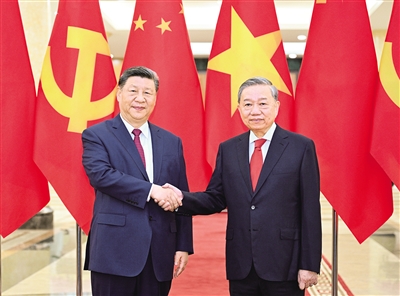 习近平指出,构建中越命运共同体具有重要世界意义。两国携手走和平发展道路,15亿多人口共同迈向现代化,将有力维护地区乃至世界和平稳定,促进共同发展。两国都坚持对外开放,为维护地区产业链供应链稳定畅通、促进经济全球化发挥了积极作用。小船孤篷经不起惊涛骇浪,同舟共济方能行稳致远。中国和越南都是经济全球化的受益者,要增强战略定力,共同反对单边霸凌行径,维护全球自由贸易体制和产业链供应链稳定。