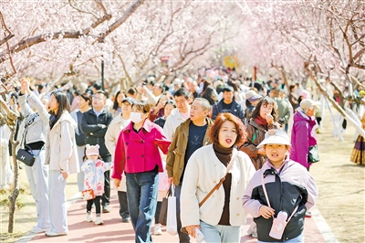 满园的桃花在微风吹拂下,特别好看,散发出阵阵花香。游客徜徉其间,打卡拍照、嬉戏游玩,非常惬意。