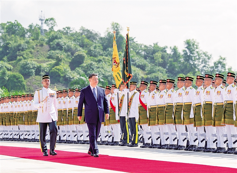 习近平乘车抵达时,易卜拉欣和马来西亚总理安瓦尔在下车处热情迎接。两国元首登上检阅台,军乐团奏中马两国国歌,鸣礼炮21响。习近平检阅仪仗队。两国元首进入国家王宫大厅,同双方陪同人员握手致意。