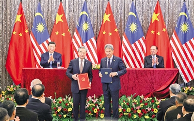 二是凝聚发展合力,打造高质量发展合作标杆。■下转第2版 ■上接第1版 中国致力于以高质量发展全面推进中国式现代化,同马来西亚“昌明经济”计划异曲同工。双方要携手培育壮大数字经济、绿色经济、蓝色经济、人工智能等前沿合作,加强产业链、供应链、价值链、数据链、人才链融合发展。推动传统领域合作转型升级,促进双向投资。推进铁海联运,实现“两国双园”提质升级,将马来西亚重要港口打造成“陆海新通道”重要枢纽。