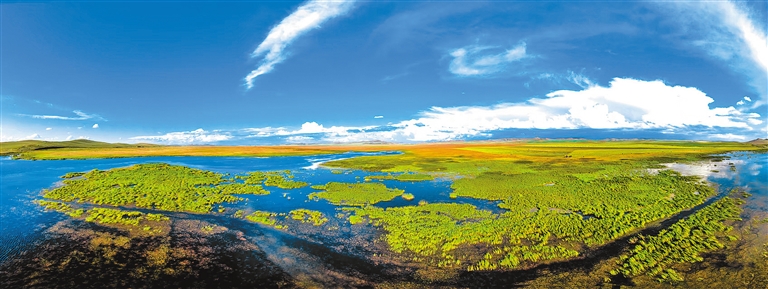 湖水折射着太阳的光,亮亮的,蓝天白云仿佛沉到了湖底,水鸟扑棱着翅膀,翩翩起舞,河岸和远山的倒影,仿佛是天与地之间的分割线。