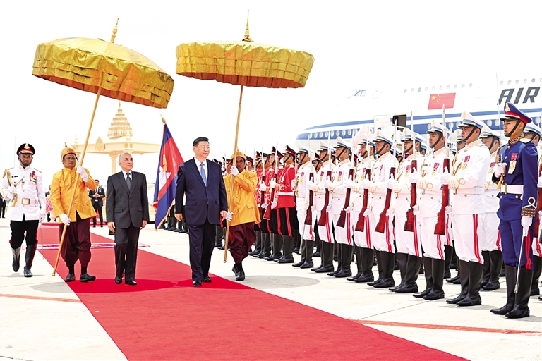 两国元首登上检阅台。军乐团奏中柬两国国歌。习近平在西哈莫尼陪同下检阅仪仗队。两国元首分别同对方陪同人员握手致意。
