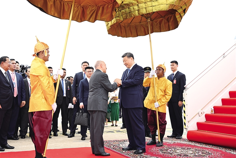 习近平乘专机抵达金边国际机场时,西哈莫尼国王率夏卡朋亲王、阿伦公主等王室成员,人民党主席、参议院主席洪森,国会第一副主席钱业以及郭索帕、布拉索昆、韩春那洛、韶索卡、洪玛尼等五位副首相在机场热情迎接。礼兵分列红毯两侧。柬埔寨王室珍娜公主向习近平献上茉莉花手环,女青年沿途向红地毯抛撒花瓣。
