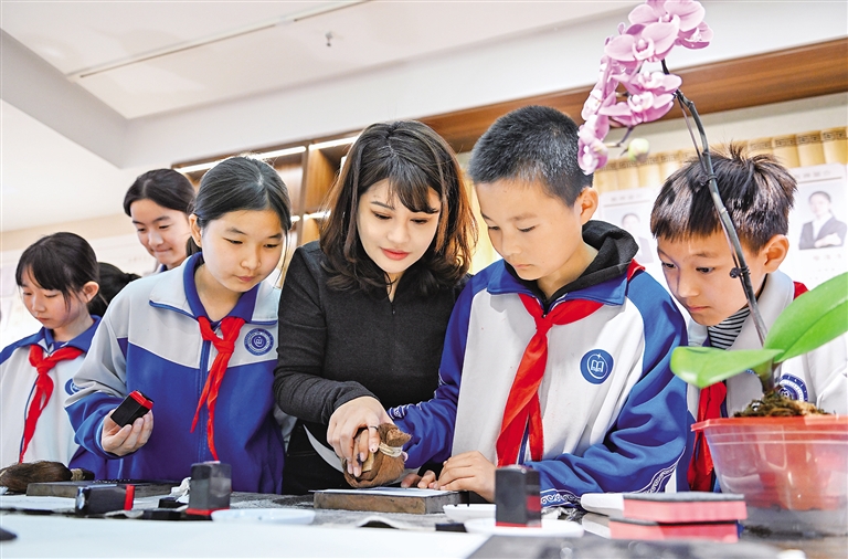 4月18日,学生们在内蒙古自治区图书馆古籍修复师的指导下体验雕版印刷。当日,内蒙古自治区图书馆与呼和浩特市第三十中学在呼和浩特市举行馆校共建教育联盟单位签约授牌仪式,双方以古籍文化为纽带,携手开启传统文化传承新征程。本报记者 王磊 摄