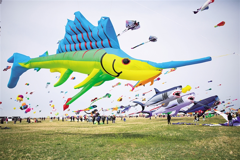 4月18日,参赛选手在潍坊市滨海云门国际风筝放飞场放飞大型软体风筝。当日,作为第42届潍坊国际风筝会的系列活动之一,第21届世界风筝锦标赛在山东省潍坊市滨海云门国际放飞场开赛,来自51个国家和地区的257支队伍、1971只参赛风筝参加角逐。新华社发
