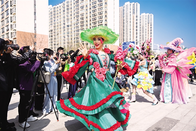 4月19日,装扮成花仙子造型的工作人员同市民和游客互动。当日,“花漾青城”2025呼和浩特赏花季系列文旅活动在首府启动,通过绿色骑行赏花等活动,让市民和游客在烂漫的花海中感受塞外青城春的气息。本报记者 王磊 摄