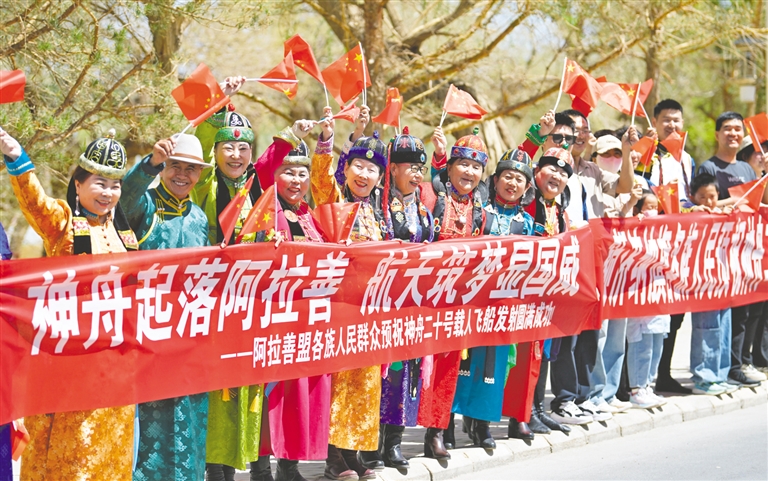 4月24日早晨的额济纳旗,天空澄澈如洗,金色的阳光倾泻在广袤的戈壁上。家住赛汉陶来苏木的牧民卫其勒格其早早就开始梳洗准备,今天他要去旗里的东风航天城也就是酒泉卫星发射中心去看神舟二十号发射升空。