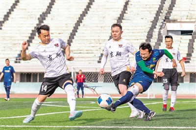 4月26日,踢球者俱乐部球员(蓝)在比赛中射门。当日,“体彩杯”呼和浩特第十一届业余足球联赛启幕。赛事吸引13支青年组队伍和18支元老组队伍参加,赛程持续至7月中旬。本报记者 于涛 摄