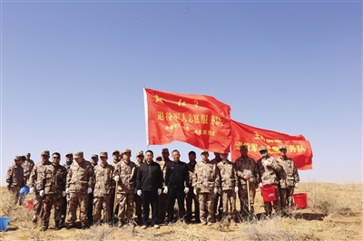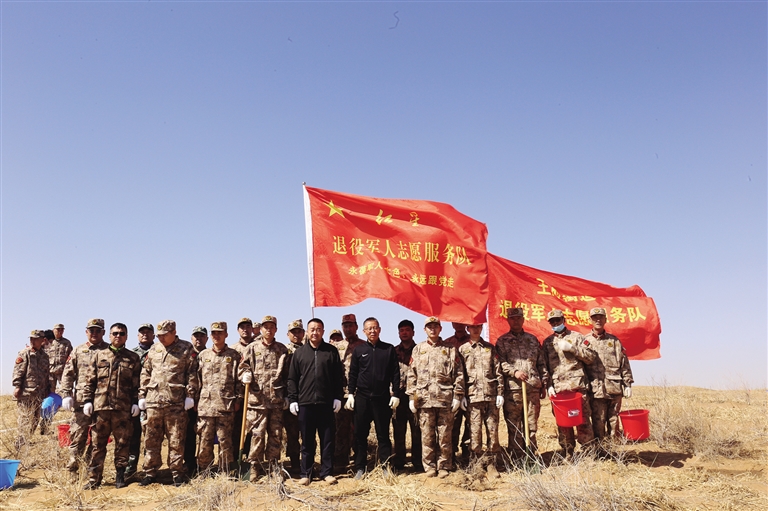 生态攻坚战,荒漠戈壁植绿魂。近两年来,阿拉善全盟退役军人参与植树12场次,种植耐旱苗木1.2万株,巡护草原林地3000平方公里,用铁锹与脚步在荒漠戈壁筑起“绿进沙退”的生态防线,让“人沙和谐”从愿景变为实景。这些扎根基层的服务,如戈壁星辰汇聚成独具特色的志愿矩阵,让“退役不褪色,退伍不退志”精神在边疆大地处处开花。