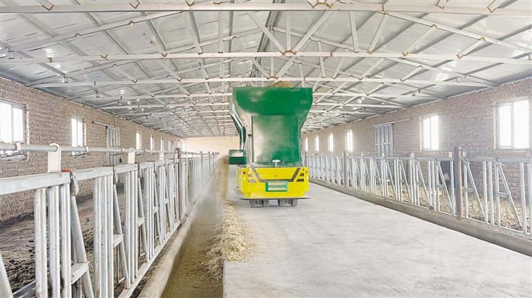 在牛舍,每头牛都戴着专属“身份证”,身上的温度检测发情设备配合分群系统,能精准识别发情母牛并分群管理,使配种成功率提升至92%。智能饲喂系统优化饲喂方案,使饲料成本降低18%,肉牛日均增重提高23%。在村民冯中卫承包的标准化棚圈,智能扫地机正清理着养殖区。“这个‘星级牛宾馆’,年收入能到30万元!”冯中卫高兴地说道。