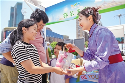 4月28日,鄂尔多斯市响沙湾景区推荐官将浪漫文旅伴手礼送给游客。当日,“歌游内蒙古 相约那达慕”鄂尔多斯风采推介会在上海举行,鄂尔多斯文旅发出盛情邀约,诚邀上海及各地游客前往感受其独特风情。本报记者 王磊 摄