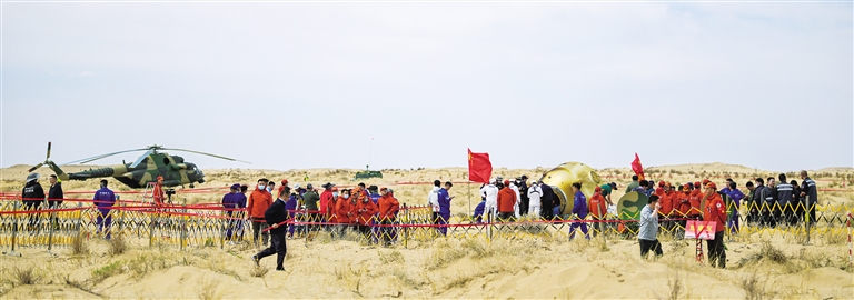 13时08分,神舟十九号飞船返回舱裹挟着灼热的气浪稳稳扎入戈壁滩的怀抱。舱体触地的刹那,金色沙尘如巨浪般腾空而起,又在戈壁的疾风中迅速弥散。早已严阵以待的搜救分队如同离弦之箭,直升机旋翼的呼啸声与越野车的引擎轰鸣,在戈壁上奏响生命接力的交响。