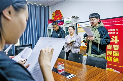三北治沙青年突击队宣传报道组成员崔冉昕乐观爱笑,总是抱着相机到处跑,她自嘲是青年突击队里的老人,其实也刚满35周岁。“我想把治沙人最美的一面展示出来,看着沙漠变绿洲的过程很治愈。”崔冉昕对治沙人有着特殊的情感,他的父辈作为土生土长的磴口人,治沙40载,自幼在沙漠环境中长大,吃着沙子拌饭、睡在沙窝铺,他们那代人从小就立志让大漠变为绿洲。1997年出生的张乐天是磴口县团委副书记,作为宣传报道组成员,她的一项重要工作就是宣讲磴口模式下的感人故事,采访收集素材、写演讲稿、口才训练,怀孕三个月的她不辞辛劳上下奔波。“为了让更多人了解防沙治沙工作,讲述党领导下的防沙治沙磴口故事, 我觉得很有意义,身边的治沙故事也在感染着我。”