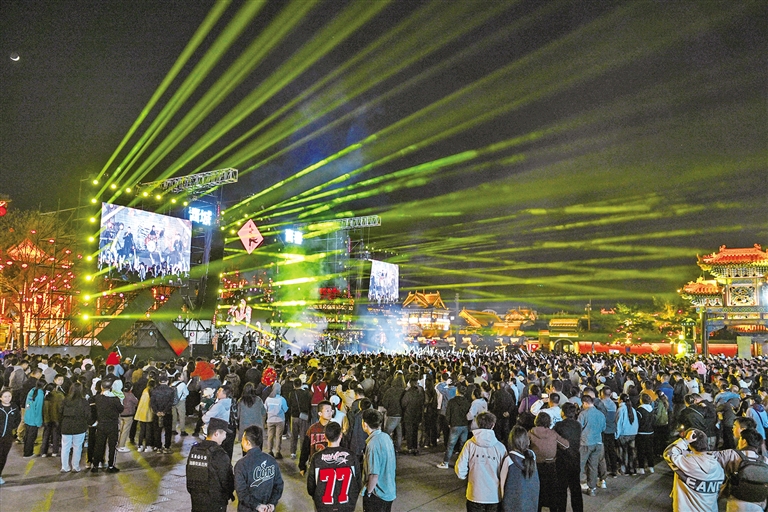 5月2日晚,市民和游客在呼和浩特市玉泉区塞上老街旅游休闲街区观看音乐表演。今年“五一”假期,呼和浩特市以“青城·青春”为主题,在塞上老街旅游休闲街区、敕勒川草原、小草公园、大黑河军事文化乐园、回空间艺术中心、昭君博物院打造七大主体文旅活动,让传统文化与青春潮流碰撞出全新火花。本报记者 王磊 摄