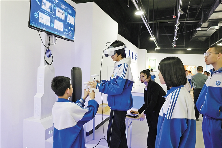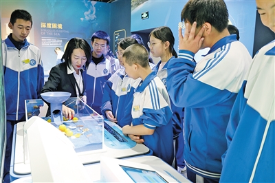 学生们通过多媒体机电互动的“钓鱼”寻宝游戏,了解深海矿藏种类及贮量方面的知识。王子晗 摄