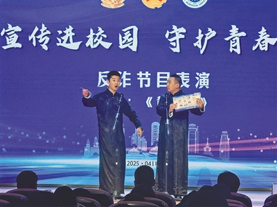 4月17日,首场活动在内蒙古大学举行。活动现场,青年民警脱去警服穿起长衫,将反诈知识排成相声;戴上墨镜、拿起麦克风,民警现场唱起了反诈rap;专业律师走上舞台“以案释法”,从专业角度解读电信诈骗;现场反诈知识有奖问答环节,吸引同学们踊跃互动……一个个从各个盟市公安局精心遴选而来的反诈节目,与兼具知识性与趣味性的环节设置,让现场掌声不断。