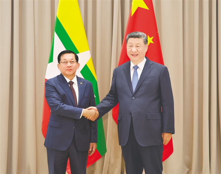 习近平指出,中缅是同甘共苦、守望相助的命运共同体。中缅两国共同倡导的和平共处五项原则和万隆精神历久弥坚,时代价值不断凸显。今年是两国建交75周年,中方将秉持睦邻、安邻、富邻、亲诚惠容、命运与共的理念方针,同缅方深化命运共同体建设,高质量共建“一带一路”,落实好全球发展倡议、全球安全倡议、全球文明倡议,给两国人民带来更多福祉。前不久,缅甸曼德勒强烈地震造成重大人员伤亡和财产损失,中方最早派出救援力量,援助紧急人道主义物资,愿继续提供帮助,支持缅方重建家园。中方支持缅甸走符合本国国情的发展道路,维护主权独立、领土完整、国家稳定,稳妥推进国内政治议程。双方要深化战略合作,持续推进中缅经济走廊重点项目建设。希望缅方切实保障在缅中方人员、机构、项目安全,加力打击网赌电诈等跨境犯罪。双方要共同捍卫以联合国为核心的国际体系和以国际法为基础的国际秩序,维护发展中国家正当权益。