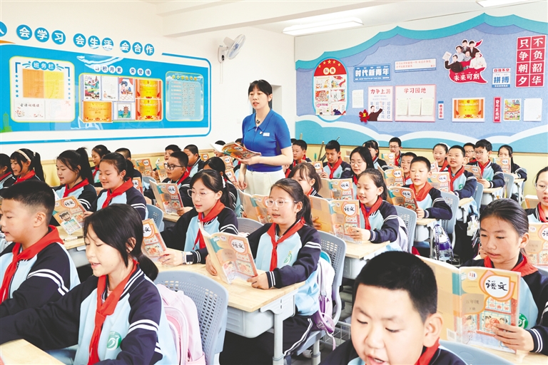 5月9日,呼和浩特市新城区团结小学五年级二班学生在朗诵经典诗词《将进酒》。为弘扬中华优秀传统文化,进一步提升学生综合素质,内蒙古各级各类学校通过组织学生参与诵读经典等形式多样的活动,让学生感受文化魅力,坚定文化自信。本报记者 马骏驰 摄