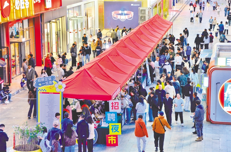 5月10日,呼和浩特市中山路王府井奥莱商场门前招聘会现场人头攒动。当日,由呼和浩特市人力资源和社会保障局主办的“夜市不打烊,offer闪亮亮”——2025年民营企业专场招聘会吸引了诸多求职者前来参加。本场招聘会上,48家企业为求职者提供1200余个岗位,以商圈“烟火气”为就业服务“聚人气”。本报记者 潘佳慧 摄