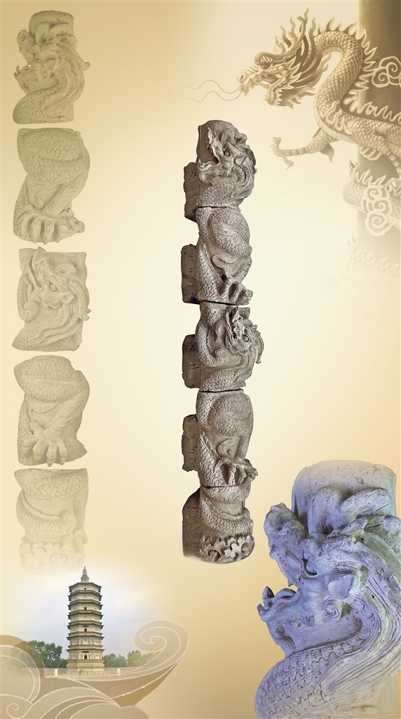 万部华严经塔一、二层转角柱共有16根砖雕盘龙柱,塔体外侧第一层砖雕盘龙柱通高267厘米,第二层砖雕盘龙柱高225厘米。上下两条龙紧紧盘绕柱身,上方龙首仰望苍穹,龙腿粗壮有力、肌肉发达,锋利的龙爪紧压柱身,仿佛欲腾空而起,直冲云霄。下方的龙形态与上方相似,但是不如上方的生动。出土砖雕盘龙柱与现有盘龙柱相比较,造型风格相同,高度不同,做工也不如现有的盘龙柱细腻。