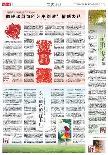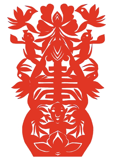 而艺术创作则不然。艺术创作需要以类似工艺制作的手段直接回应具有超功利的、审美意义的、创造性问题的思考。这在造型艺术领域应当是一般原理意义的结论,书法、绘画,乃至雕塑等其他类型的艺术作品无不遵循这一原理。无论是剪纸,还是书法、绘画,在真正的创作中,艺术家要从自己多年积累的技艺中提取出适应当下创作所需要的技术支撑:在书法上,表现为用某种字体、书体的书写技法完成创作过程;在绘画上,体现为通过具体的图形和绘画语言进行相应的造型表达;而在剪纸上,则是以剪塑形,在短暂的瞬间完成形象的表达和呈现。这些创作方式在具体操作上,是一个类似于工艺品制作的技术重复的过程;但至为重要是,如同在段建珺剪纸作品中看到的那样,在完成创作的同时,艺术家需要调动自己的审美经验和情感表达,在看似为工艺“制作”的过程中,激发自己对平面空间造像的想象力和表达力,让“工艺性”“技术性”的创作过程与艺术想象、情感表达相化合,最终形成能够展现艺术家生命精神和审美理想的感性形象,乃至借此解决精神寄托和人格表达的问题。