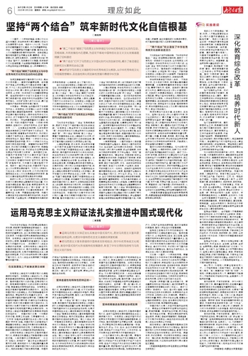从理论层面看,中华优秀传统文化是我们党创新理论的“根”,我们推进马克思主义中国化时代化的根本途径是“两个结合”。中国共产党高度重视理论创新,一百多年来的党史就是一部党的理论创新史。经过百余年的孜孜探索,中国共产党成功实现了马克思主义中国化的三次飞跃,成功将中国特色社会主义事业推向新的发展阶段。历史经验表明,“两个结合”是我们取得成功的最大法宝。“两个结合”赋予了马克思主义基本原理以五千多年中华文明的厚重底蕴,赋予了中华优秀传统文化以新的时代内涵,使马克思主义成为中国的、中华优秀传统文化成为现代的。深刻理解把握新时代治国理政的战略部署,也需要运用好“两个结合”,在深度挖掘中华优秀传统文化中蕴含的社会治理思想、社会价值追求、大一统理念、家国情怀和国家交往之道、经济社会发展伦理、生态理念等宝贵资源过程中,把握中国式现代化这个实际,并使之与马克思主义基本原理相结合,着力建构中国式现代化的理论体系。