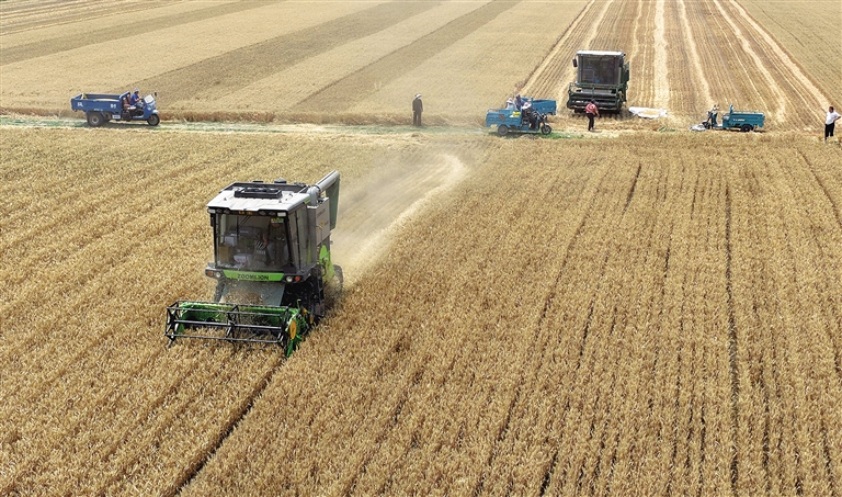 5月21日,在安徽省亳州市利辛县巩店镇巩店村,收割机在麦田里收割小麦(无人机照片)。麦收时节,各地农民抢抓农时抢收小麦,确保颗粒归仓。 新华社发