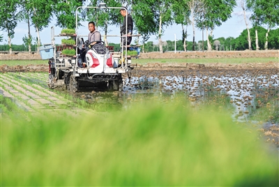 5月22日,在内蒙古兴安盟扎赉特旗好力保镇一处稻田中,农民使用卫星导航、自动驾驶的农用机械插秧。扎赉特旗正值水稻插秧季,当地农民应用卫星导航、纸膜插秧等现代农业技术,紧抓农时,田间一派繁忙景象。新华社记者 贝赫 摄