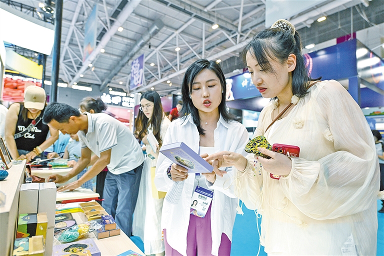 工作人员向参会者介绍来自内蒙古博物院的文创产品。