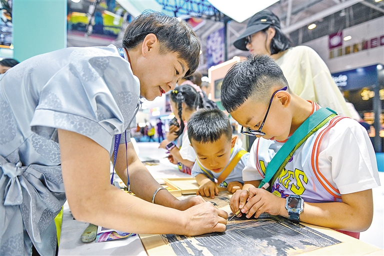 版画创作者现场指导小朋友学习扎鲁特版画雕刻技艺。