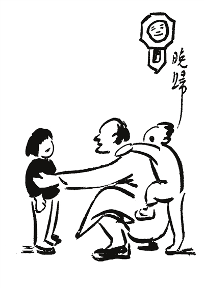 关于第二点,“蹲下身,看着孩子说话”,是由漫画《晚归》读出来的感觉与意味。丰子恺先生以此漫画讲一件小事,表达父亲与儿女的互爱之情。父亲下班归来,刚一进屋,一直在家中等待爸爸归来的两个孩子开心地跑到爸爸身边,爸爸就地蹲下身子,哥哥即刻爬到爸爸的背上,妹妹静静地站在爸爸面前,爸爸和蔼地看着女儿——构成了一幅小别相逢乐趣图,让人感到温暖和幸福。我们可以想象,工作了一天且下班已晚的父亲原本是身体疲惫,但归家后看见雀跃而来的一双儿女,顿时因快乐而消解了一身的疲惫,并使真爱温润的人间情味暖遍了整个家庭。