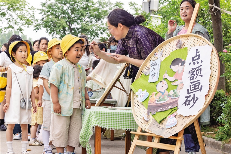 5月30日,老师在江苏省泰州市海陵区秋雪湖幼儿园给小朋友额头上点朱砂。端午节临近,各地举办丰富多彩的活动,迎接传统节日。 新华社发