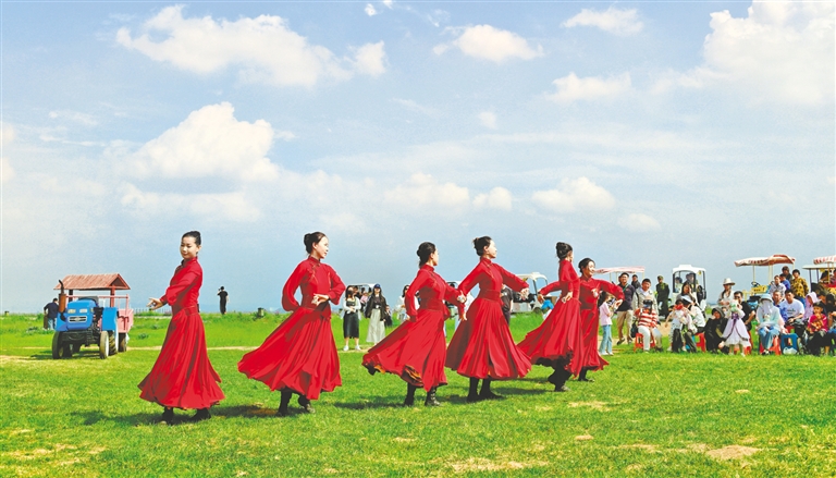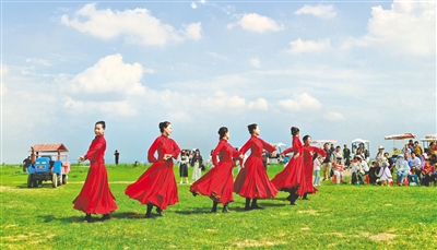 6月2日下午,呼和浩特市乌兰牧骑队员在敕勒川草原演出原创实景剧目“欢腾的敕勒川”。该剧目将呼麦、马头琴、长调、民族歌舞等多种艺术形式与实地布置的蒙古包、勒勒车、牛羊马圈等生活化场景融为一体,给广大游客带来沉浸式体验和视听享受。 本报记者 牟野 摄
