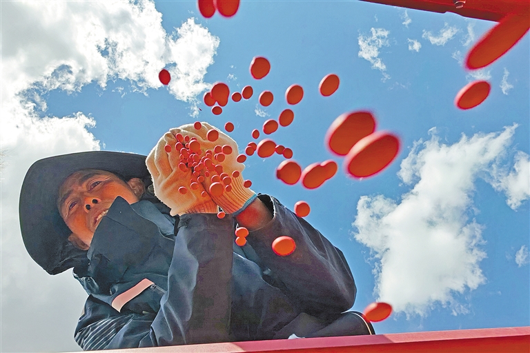 员工向大型播种机中加入包衣大豆种子。董元权 摄